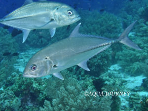 ギンガメアジ 和名:ギンガメアジ 英名:Bigeye Trevally 学名:Caranx sexfasciatus 体長:約60㎝ 生息環境:サンゴ礁域の中層 生息水深:10~30m あいうえお あいうえお 黒色はオスの婚姻色
