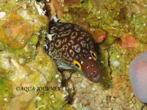 オキナワノコギリウツボ 和名:オキナワノコギリウツボ 英名:Elegant Moray 学名:Gymnothorax elegans 体長:約70㎝ 生息環境:サンゴ礁域の横穴やくぼみ 生息水深:15~25m