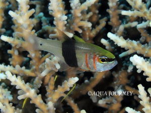 クロオビアトヒキテンジクダイ 和名:クロオビアトヒキテンジクダイ 英名:Blackbelted Cardinalfish 学名:Taeniamia zosterophora 体長:約7㎝ 生息環境:サンゴ礁域 生息水深:10~20m あいうえお あいうえお