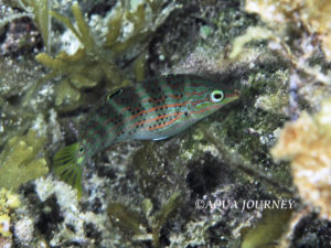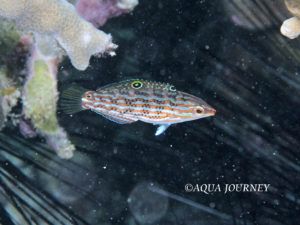 サオウィサタ・ラス 和名:なし 英名:Saowisata Wrasse 学名:Halichoeres binotopsis 体長:約8㎝ 生息環境:サンゴ礁域 生息水深:3~7m 成魚(メス) あいうえお あいうえお 若魚