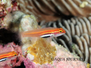 シロオビイソハゼ 和名:シロオビイソハゼ 英名:Blackbelly Dwarfgoby 学名:Eviota atriventris 体長:約2㎝ 生息環境:サンゴ礁域 生息水深:10~30m 成魚(オス) あいうえお あいうえお 成魚(メス)