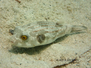 スジモヨウフグ 和名:スジモヨウフグ 英名: Narrow-lined Puffer 学名:Arothron manilensis 体長:約25㎝ 生息環境:内湾の砂泥域やサンゴ礁域の浅場 生息水深:2~5m