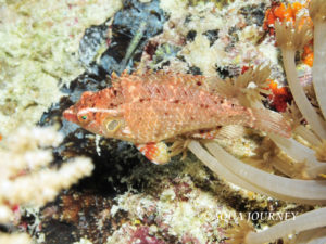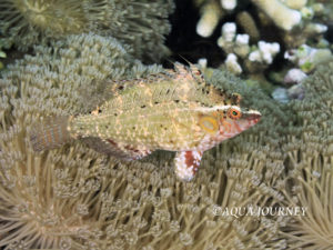タヌキオハグロベラ 和名:タヌキオハグロベラ 英名:Sneaky Wrasse 学名:Pteragogus turdus 体長:約10㎝ 生息環境:サンゴ礁域 生息水深:5~10m 成魚 あいうえお あいうえお 成魚 幼魚