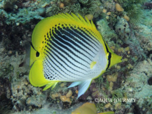 スポットテール・バタフライフィッシュ 和名:なし 英名:Spot-tail Butterflyfish 学名:Chaetodon ocellicaudus 体長:約17㎝ 生息環境:サンゴ礁域 生息水深:10~20m あいうえお あいうえお