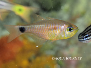 スミツキアトヒキテンジクダイ 和名:スミツキアトヒキテンジクダイ 英名: Orangelined Cardinalfish 学名:Taeniamia kagoshimanus 体長:約8㎝ 生息環境:サンゴ礁域の横穴や窪み 生息水深:15~25m あいうえお あいうえお