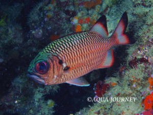 ツマグロマツカサ 和名:ツマグロマツカサ 英名:Shadowfin Soldierfish 学名:Myripristis adusta 体長:約30㎝ 生息環境:サンゴ礁域の岩陰など 生息水深:10~20m あいうえお あいうえお