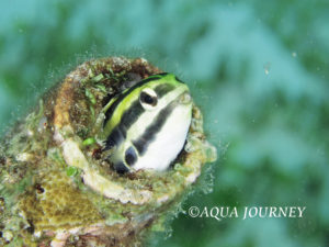 ヒゲニジギンポ 和名:ヒゲニジギンポ 英名:Striped poison-fang Blenny 学名:Meiacanthus grammistes 体長:約8㎝ 生息環境:サンゴ礁域 生息水深:10~20m あいうえお あいうえお
