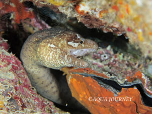 ヒレオビウツボ 和名:ヒレオビウツボ 英名:Barredfin Moray 学名:Gymnothorax zonipectis 体長:約50cm(?) 生息環境:サンゴ礁域の横穴や窪み 生息水深:10~20m あいうえお あいうえお