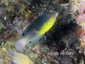 ホシススキベラ 和名:ホシススキベラ 英名:Yellowbreasted Wrasse 学名:Anampses twistii 体長:約15㎝ 生息環境:サンゴ礁域 生息水深:10~20m 成魚(オス) あいうえお あいうえお 成魚(メス) 幼魚