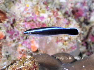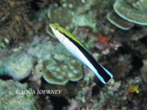 ホンソメワケベラ 和名:ホンソメワケベラ 英名:Bluestreak Cleaner wrasse 学名:Labroides dimidiatus 体長:約9㎝ 生息環境:サンゴ礁域 生息水深:5~25m 成魚 あいうえお あいうえお 幼魚