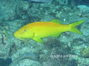 マルクチヒメジ 和名:マルクチヒメジ 英名:Gold-saddle Goatfish 学名:Parupeneus cyclostomus 体長:約30㎝ 生息環境:サンゴ礁域 生息水深:10~20m あいうえお あいうえお