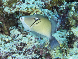 ムスメハギ 和名:ムスメハギ 英名:Boomerang Triggerfish 学名:Sufflamen bursa 体長:約20㎝ 生息環境:サンゴ礁域 生息水深:10~20m 成魚 あいうえお あいうえお 成魚 若魚