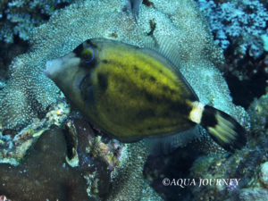 メガネウマヅラハギ 和名:メガネウマヅラハギ 英名:Spectacled Filefish 学名:Cantherhines fronticinctus 体長:約15㎝ 生息環境:サンゴ礁域 生息水深:10~20m あいうえお あいうえお