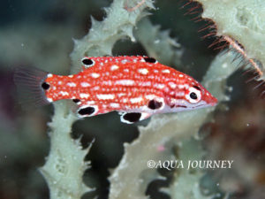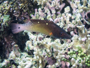 モンツキベラ 和名:モンツキベラ 英名:Redfin Hogfish 学名:Bodianus dictynna 体長:約18㎝ 生息環境:サンゴ礁域 生息水深:10~20m 成魚 あいうえお あいうえお 成魚 幼魚(写真提供:山田稔さん)