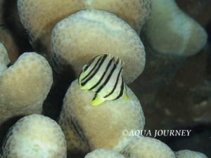 ヤスジチョウチョウウオ 和名:ヤスジチョウチョウウオ 英名:Eightband Butterflyfish 学名:Chaetodon octofasciatus 体長:約12㎝ 生息環境:サンゴ礁域 生息水深:10~15m 成魚 あいうえお あいうえお 幼魚