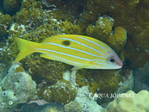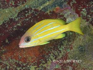 ロクセンフエダイ 和名:ロクセンフエダイ 英名:Five-lined Snapper 学名:Lutjanus quinquelineatus 体長:約25㎝ 生息環境:サンゴ礁域 生息水深:25~35m あいうえお あいうえお